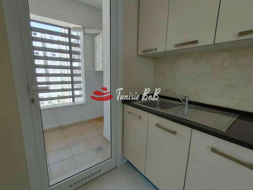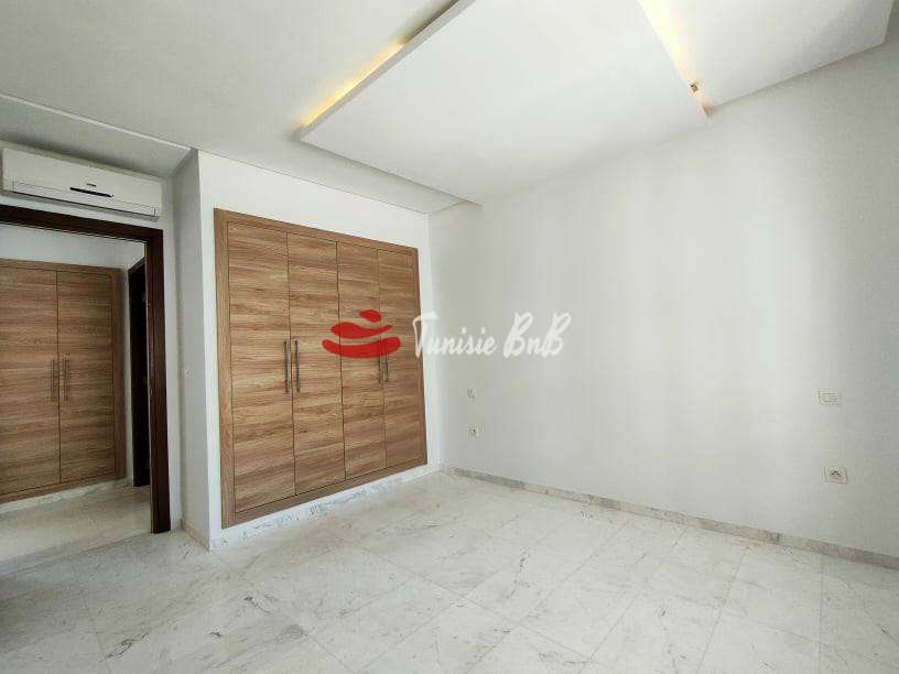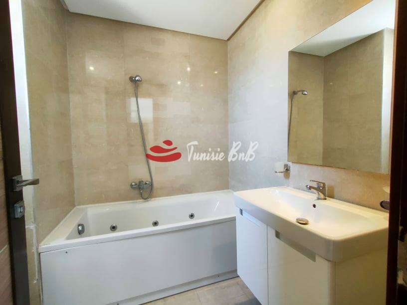 l'agence immobilière Tunisie BnB vous propose à la location un bel appartement dans une résidence calme et sécurisée . Il est composé d'un salon , salle à manger , une kitchenette équipée ( plaque hotte four ) , une salle de bain avec jacuzzi et une chambre à coucher avec dressing . une place de parking au sous-sol est disponible