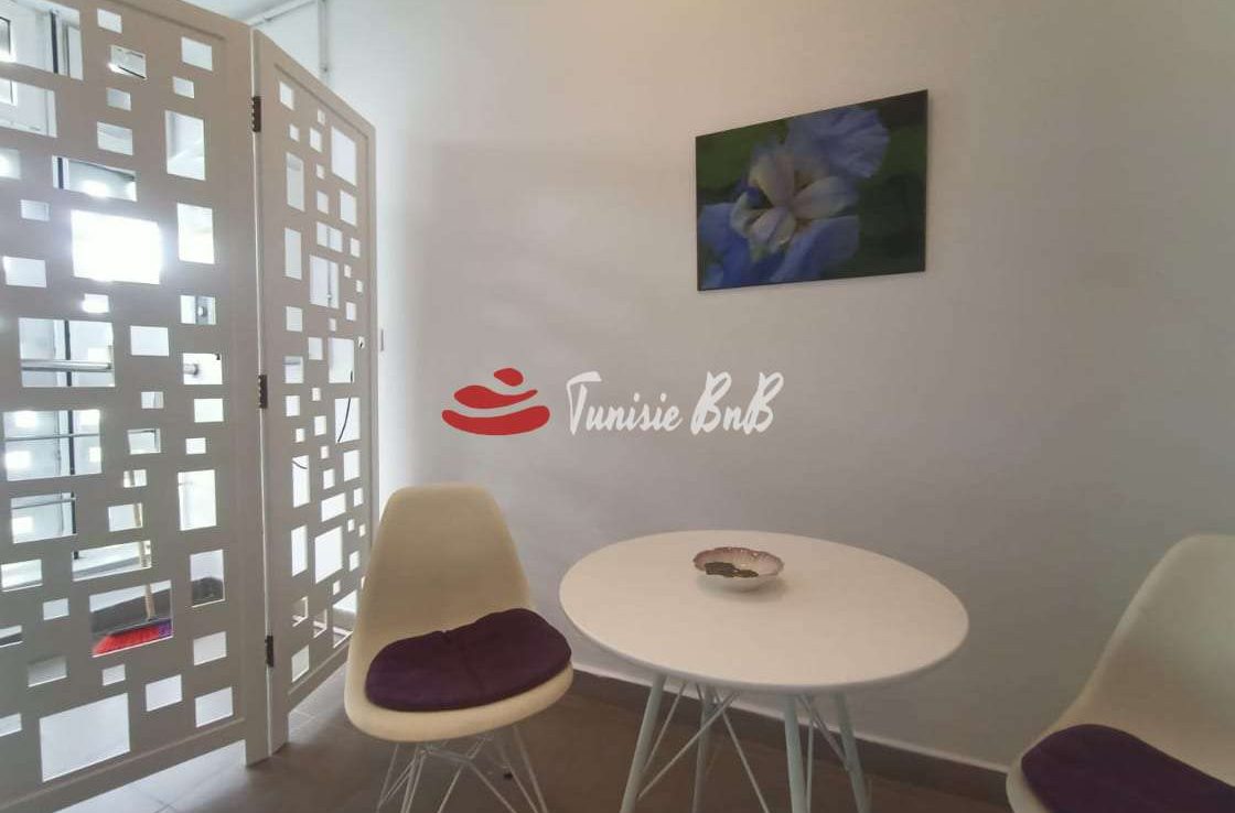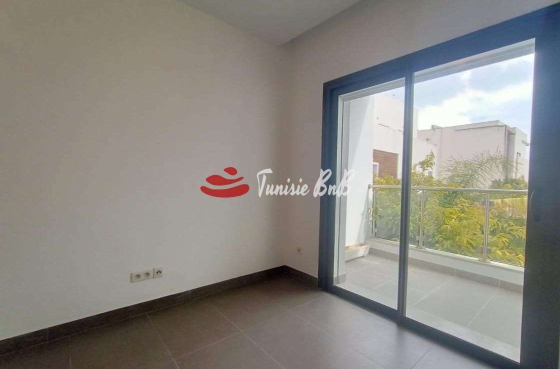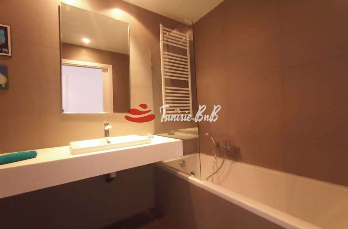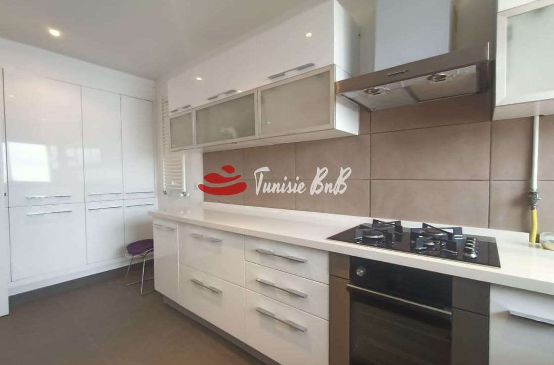 L’agence immobilière Tunisie BnB propose à la location un appartement S 2 dans une résidence calme et sécurisée. L’appartement est composé d’un grand salon une cuisine équipée, une salle d’eau invité et deux chambres avec salle de bain commune. Une place parking au sous-sol.
