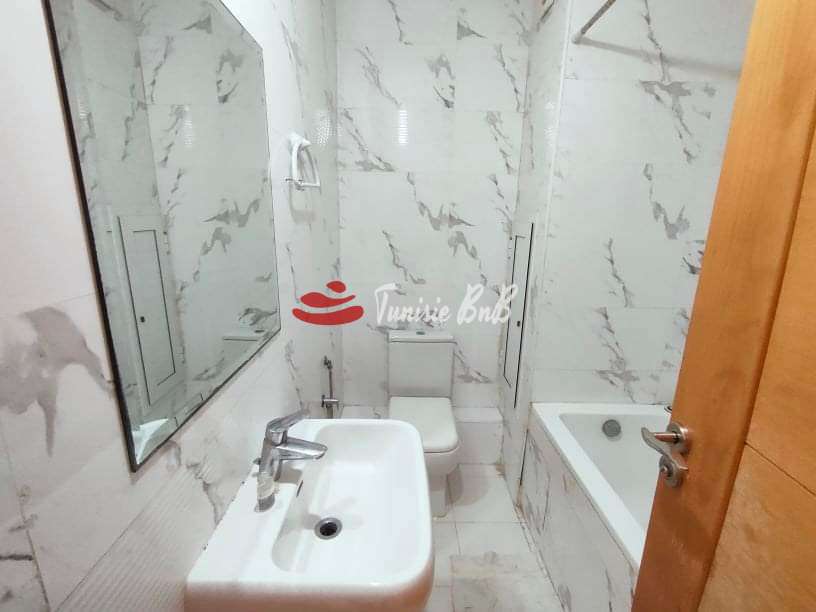 L'agence immobilière Tunisie bnb vous propose à la location un appartement S2 dans une résidence sécurisée et calme aux jardins de Carthage. Il est composé d'un salon , salle à manger , une cuisine équipée avec séchoir et deux chambres à coucher avec une salle de bain commune. Une place de parking au sous-sol est disponible