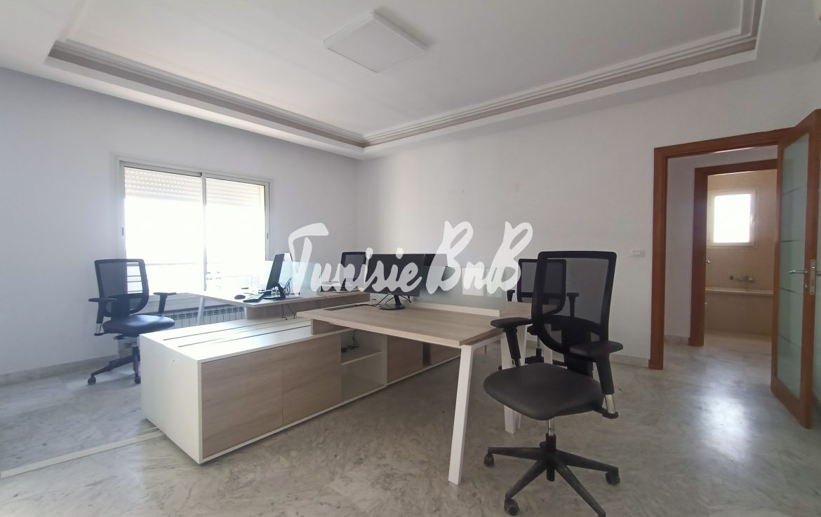 L'agence immobilière Tunisie BnB vous propose à la location un bureau de 180 composé d'un open space, un bureau et une salle d'eau. Une place de parking au sous sol est disponible.