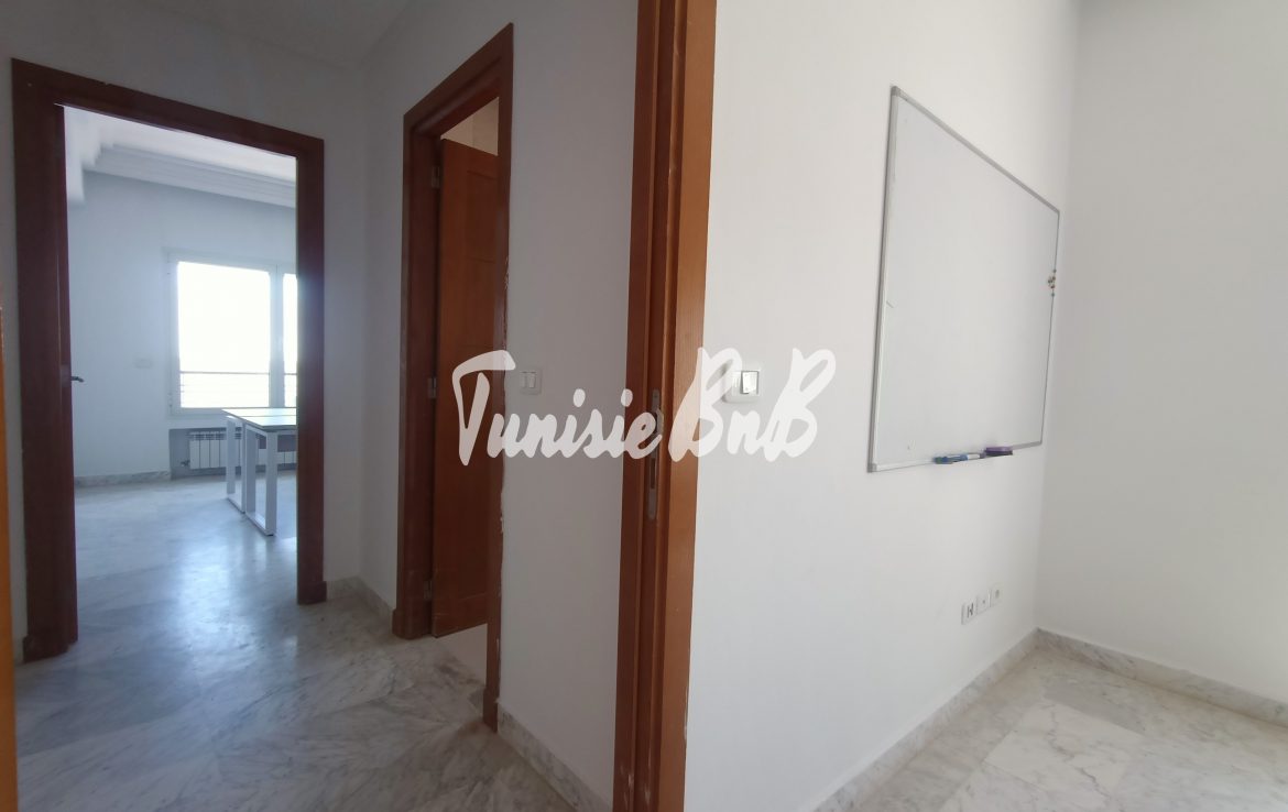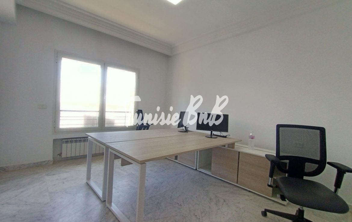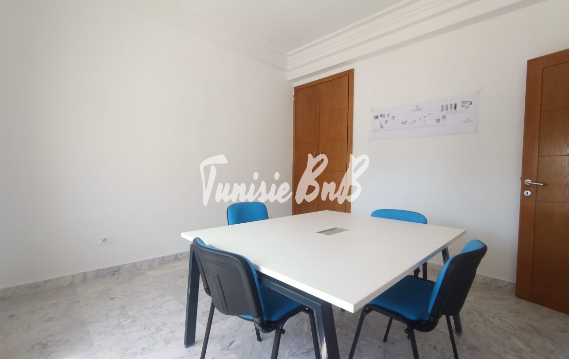 L'agence immobilière Tunisie BnB propose à la location un bureau composé de 3 pièces, une kitchenette et deux blocs sanitaires.