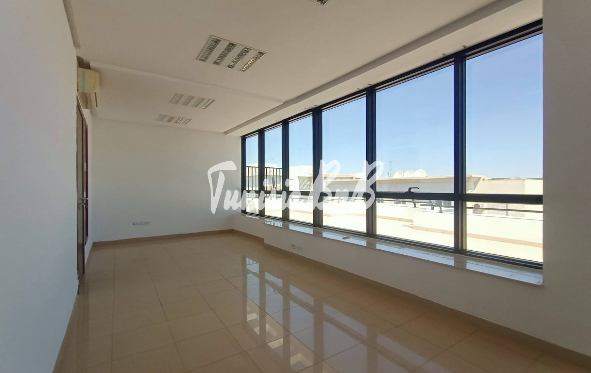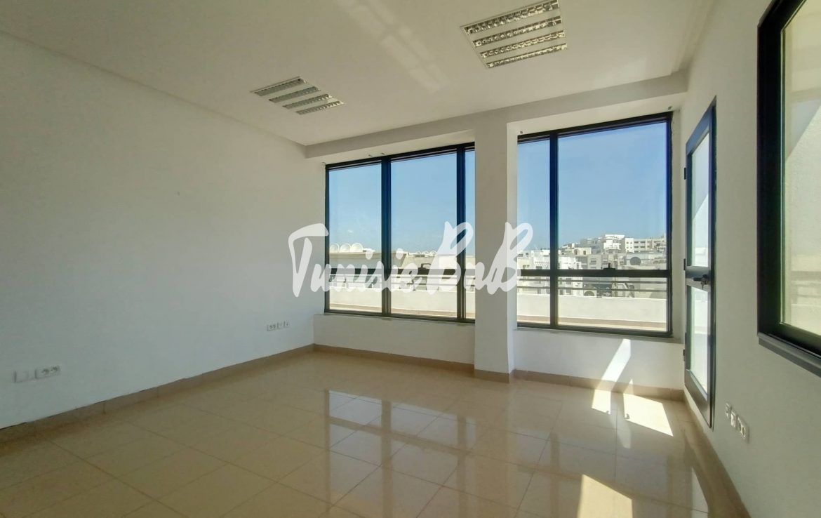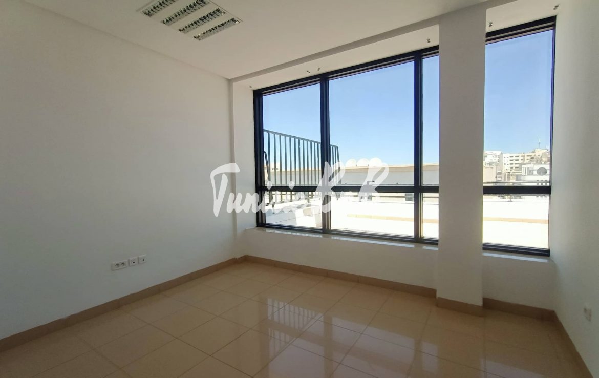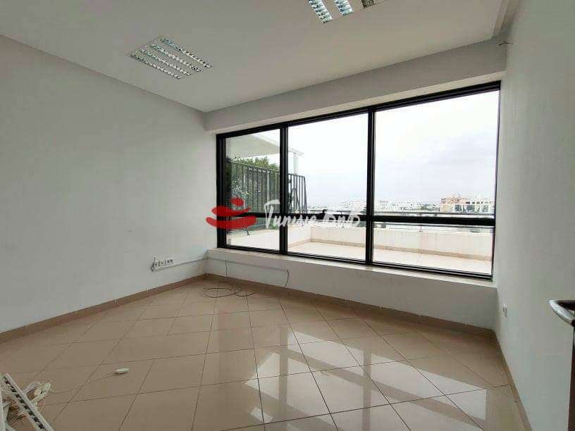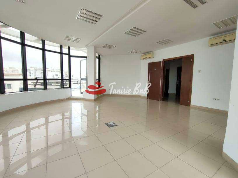 L'agence immobilière Tunisie BNB vous propose à la location un bureau de 210 m2 dans un immeuble à usage professionnel Il est composé comme suit Deux grands bureaux avec une belle terrasse , cinq autres pièces ( bureaux) , deux salles d'eau Deux places de parking au sous-sol sont disponibles