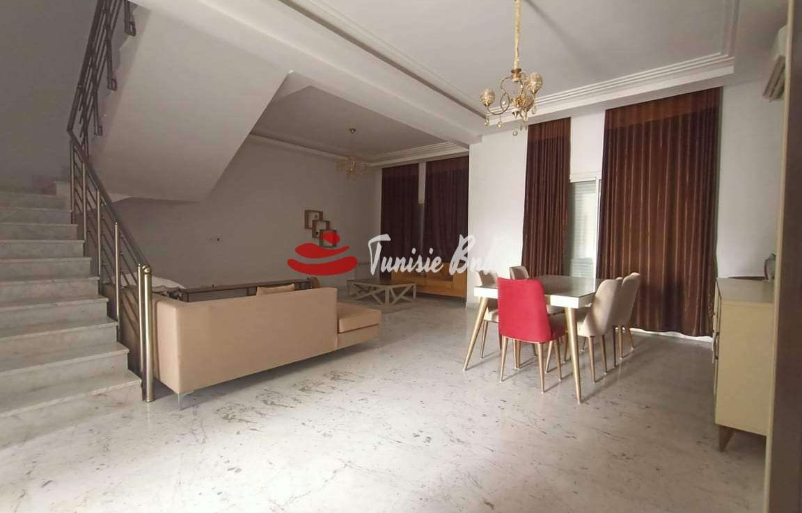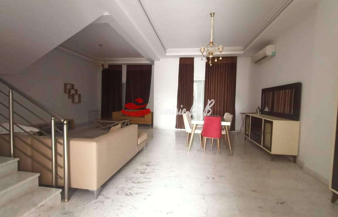 L'agence immobilière Tunisie bnb vous propose à la location un duplex dans une résidence proche de toutes commodités. Il est composé d'un salon , salle à manger , une cuisine équipée et une salle d'eau. À l'étage , deux chambres à coucher avec une salle de bain commune et une suite parentale. Une place de parking au sous-sol est disponible