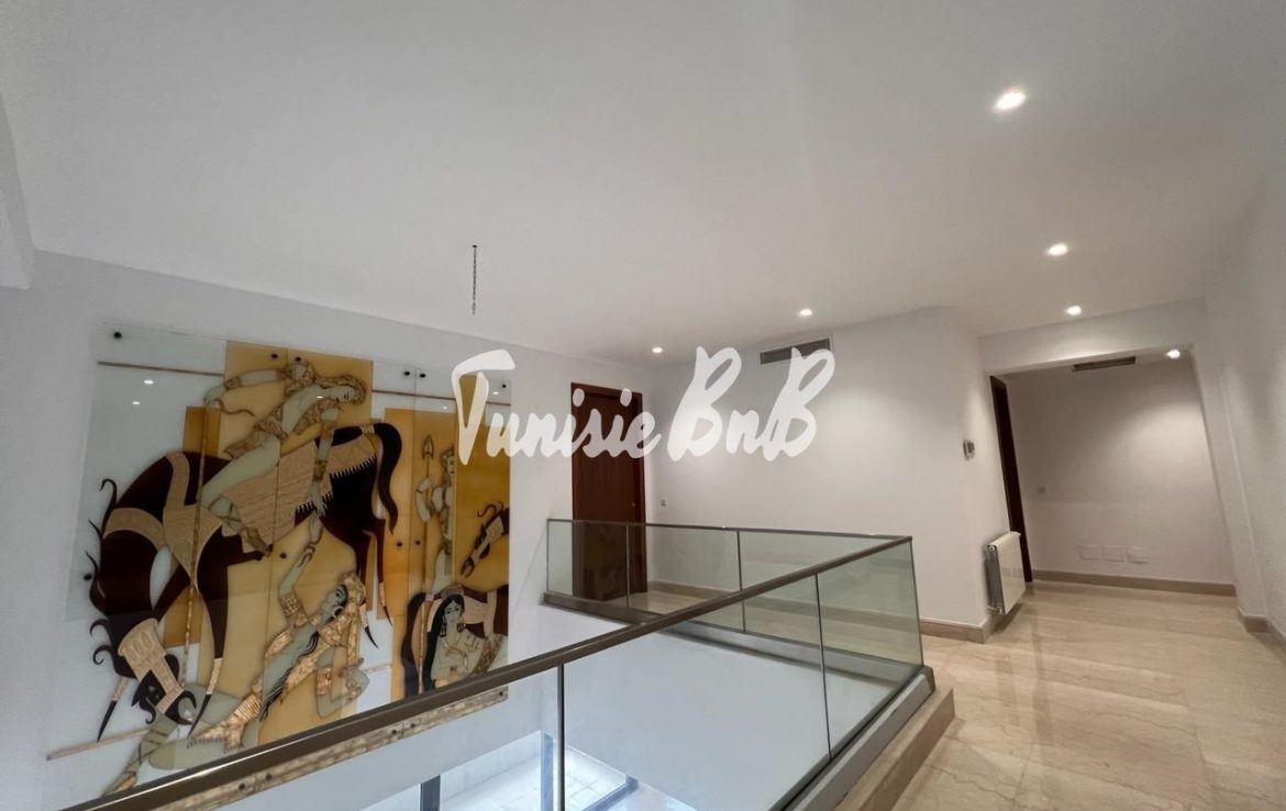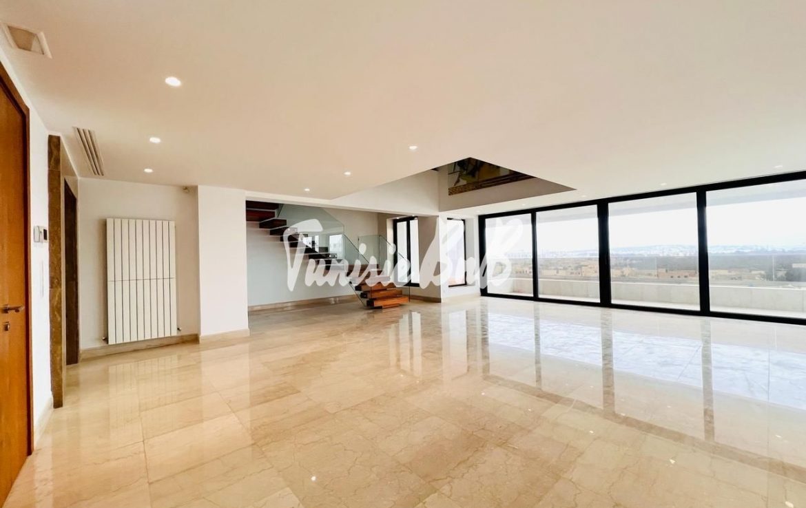 L'agence immobilière Tunisie BnB propose à la location un penthouse avec piscine privée au dernier étage d'une résidence calme et sécurisée au lac2. Il se compose d'un grand salon salle à manger qui donnent sur la piscine,une salle d'eau d'invités et une cuisine équipée. La partie nuit comporte 4 suites. Deux places parking sont disponibles au sous sol.