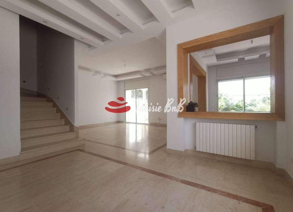 l'agence immobilière Tunisie BnB vous propose à la location une villa jumelée au lac 2 dans un quartier calme et sécurisée . Il est composé d'un grand salon , salle à manger qui donne sur le jardin , un grand séjour , une salle d'eau invité , une cuisine équipée avec séchoir. à l'étage , deux chambres à coucher avec dressings , une salle de bain commune et une suite parentale . Au sous sol , une chambre à coucher , une salle d'eau avec douche et un open space.