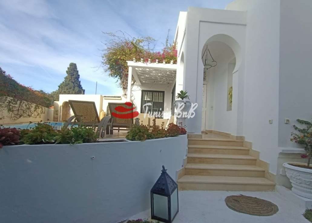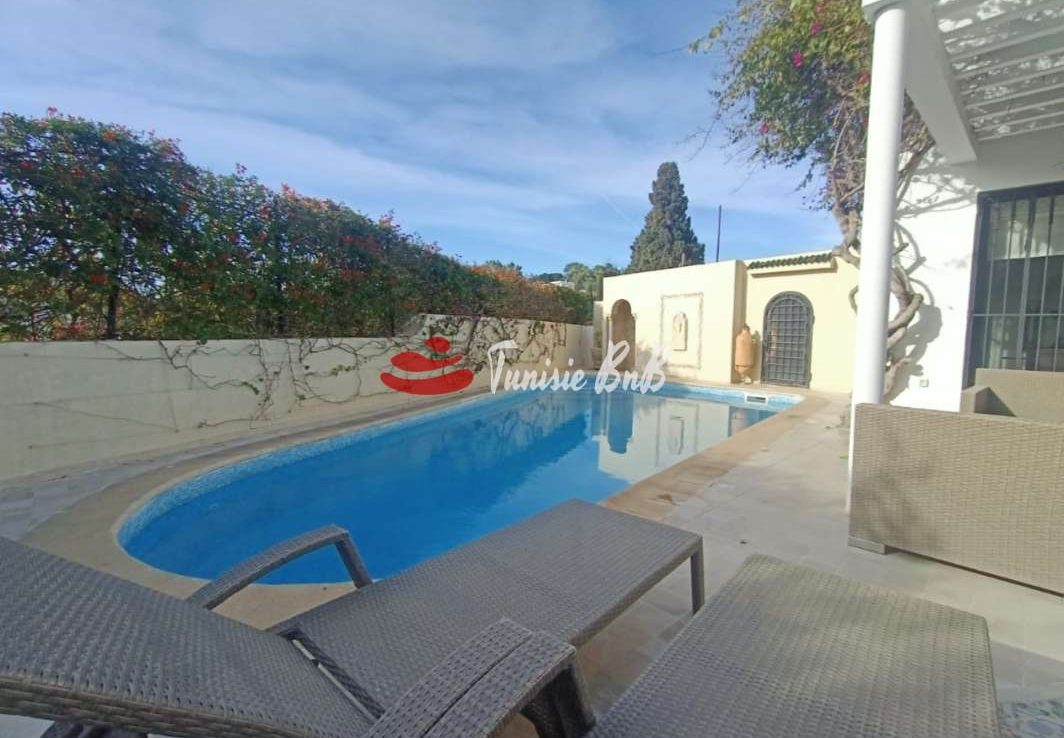 L'agence immobilière Tunisie BNB vous propose à la location une belle villa meublée avec piscine au cœur de Carthage Hannibal dans l'un des quartier les plus calme à Carthage Elle est composée d'un grand salon , salle à manger , une cuisine équipée , une salle d'eau et deux suites parentales. À l'extérieur , trois bungalows indépendant .