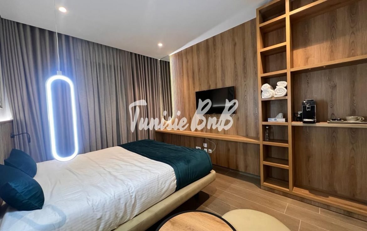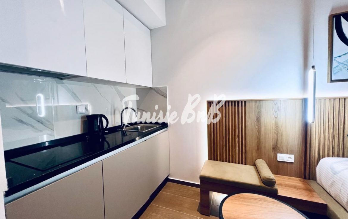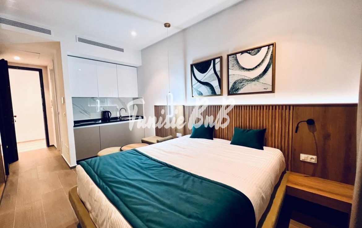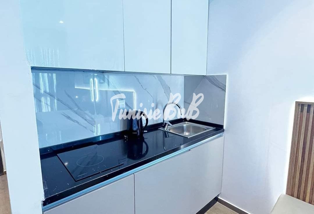 L’agence immobilière Tunisie BnB propose à la location un S+0 luxueux richement meublé retapé à neuf dans une résidence calme et sécurisée aux Jardins de Carthage . l'appartement est richement meublé située dans une résidence avec piscine et une salle de sport. Il se compose d'une chambre à coucher , une kitchenette ,une salle d’eau avec une douche à l'italienne.