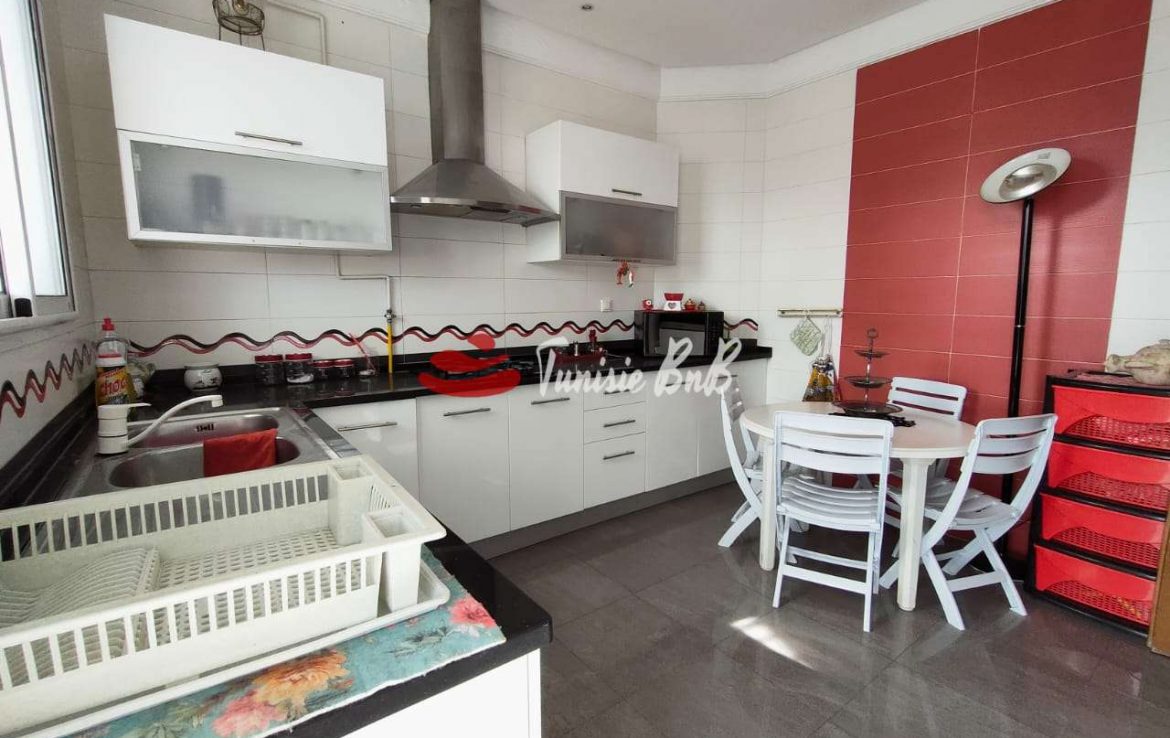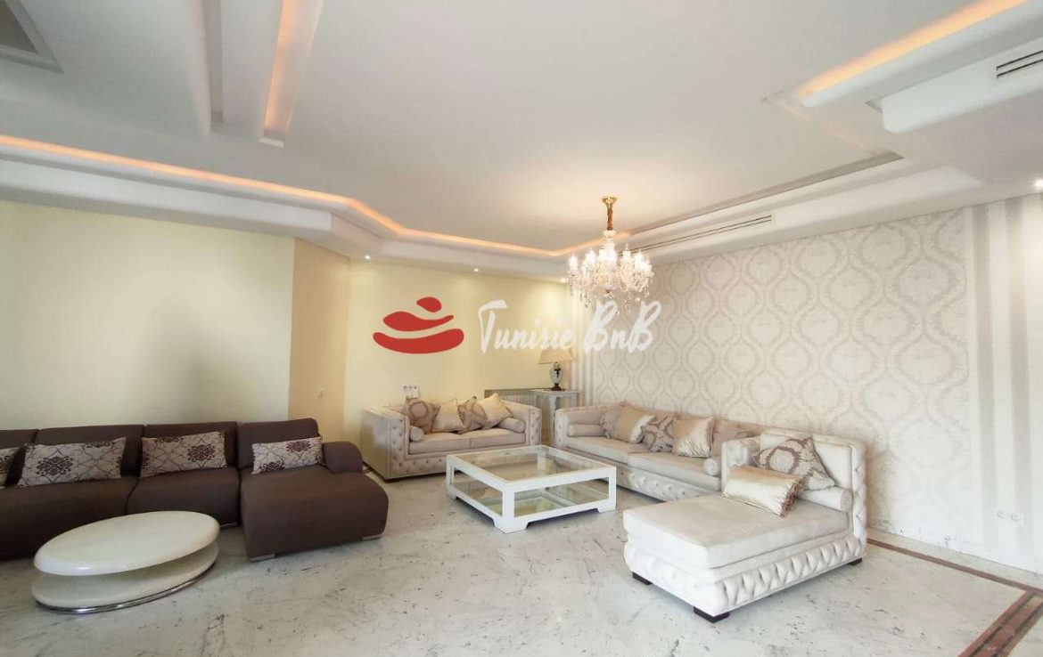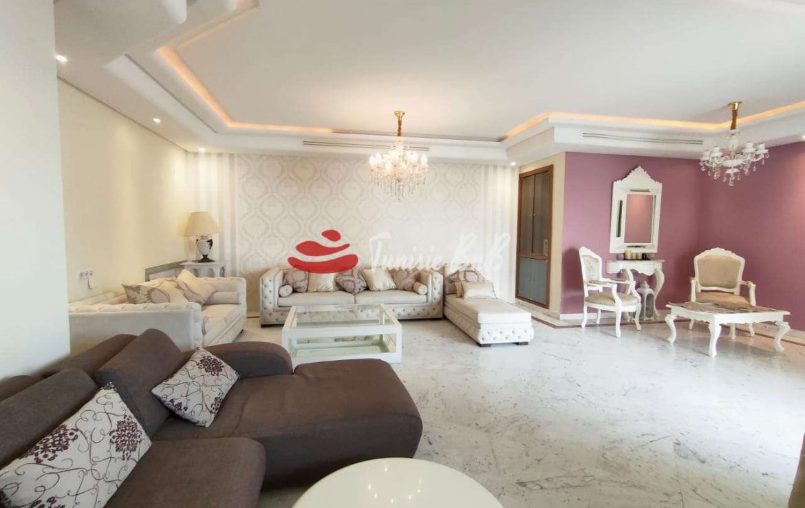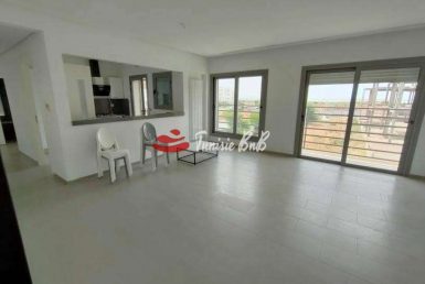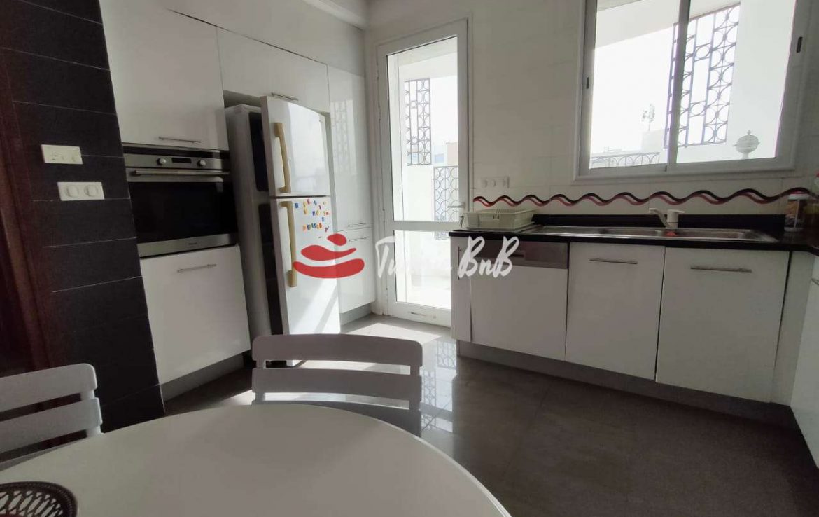 L'agence immobilière Tunisie BNB vous propose à la location un bel appartement avec terrasse composé d'un salon , une cuisine équipée , une salle d'eau , deux chambres à coucher et une salle de bain . Une place de parking au sous-sol est disponible